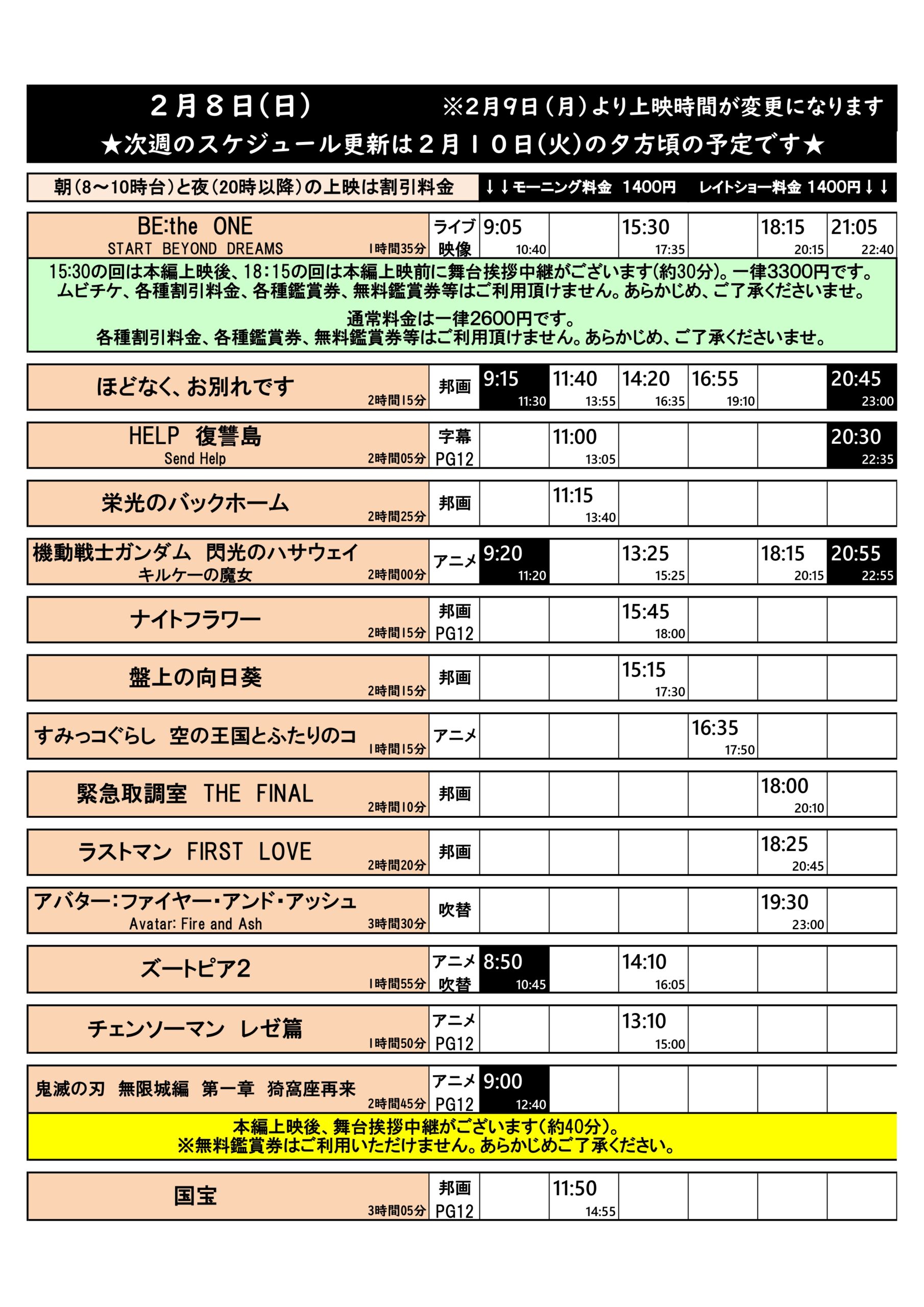 2/8(日)の上映スケジュールはこちら(毎週火曜更新)