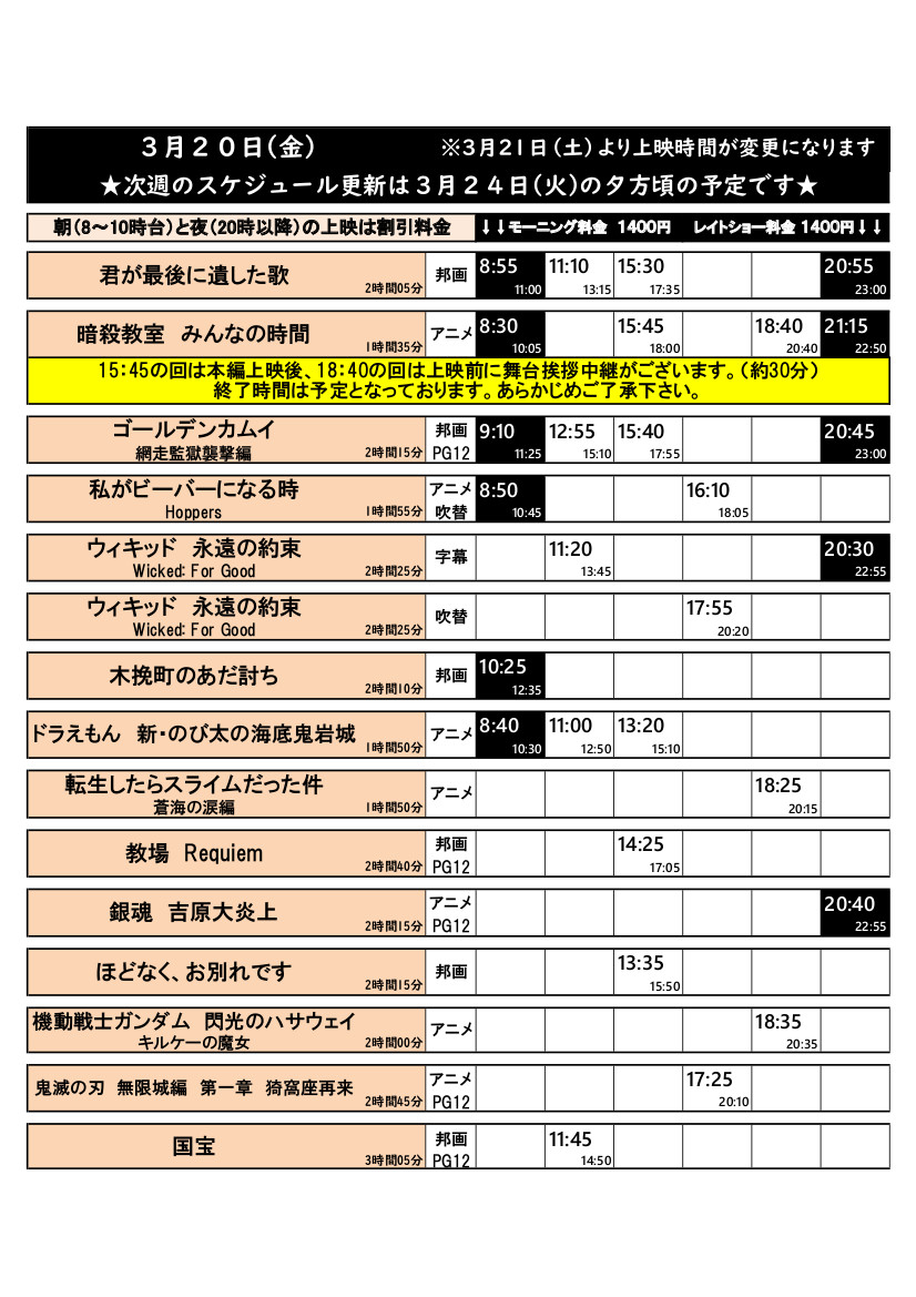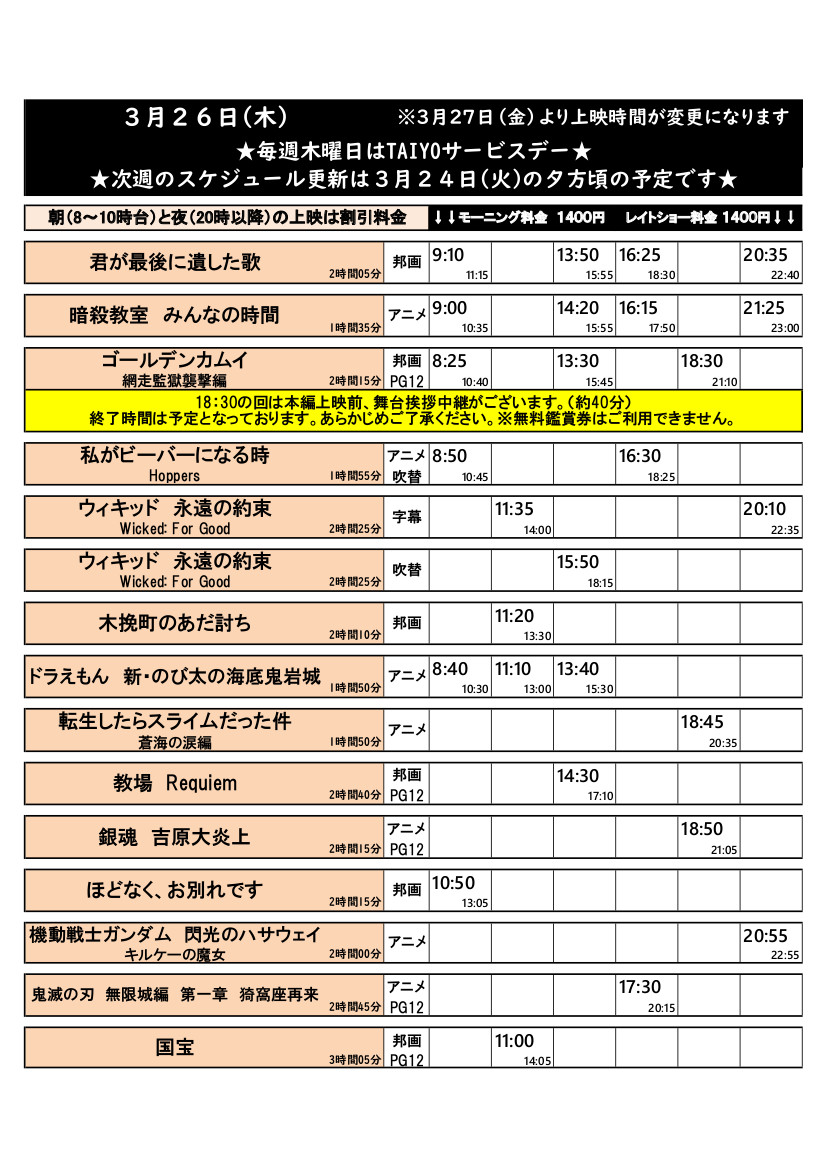 3/26(木)の上映スケジュールはこちら(毎週火曜日更新)