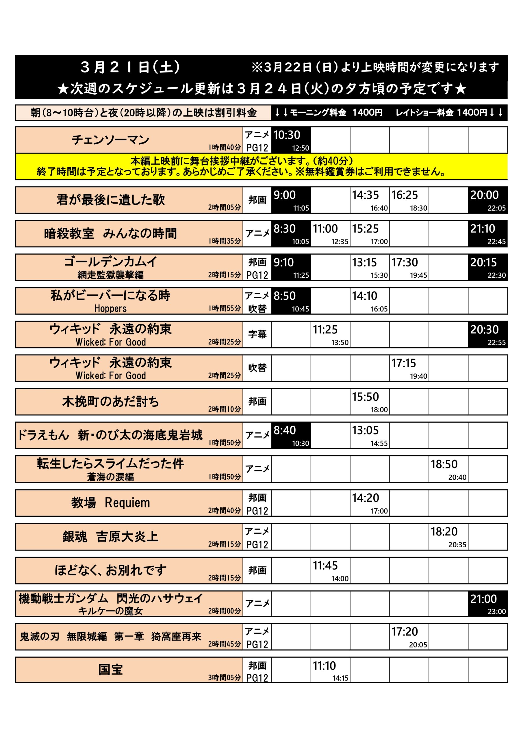 3/21(土)の上映スケジュールはこちら(毎週火曜日更新)