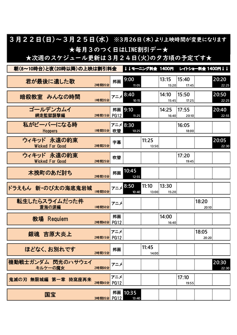 3/22(日)~3/25(水)の上映スケジュールはこちら(毎週火曜日更新)