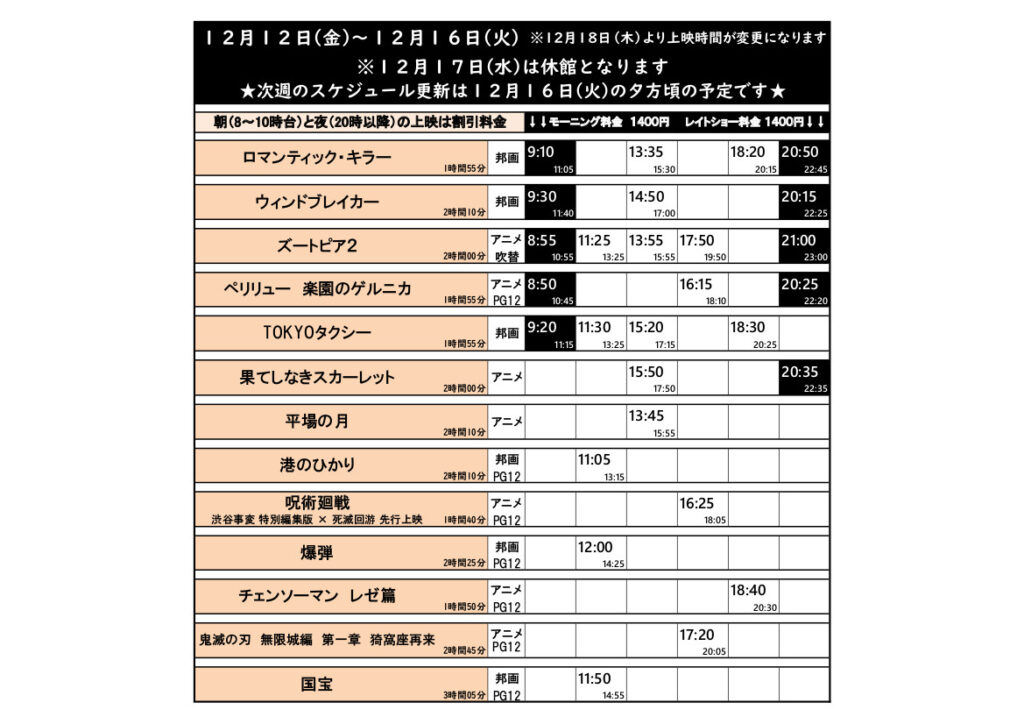 映画館シネマ太陽帯広 > 12/12(金)~12/16(火)の上映スケジュールはこちら ※12/17(水)は休館です