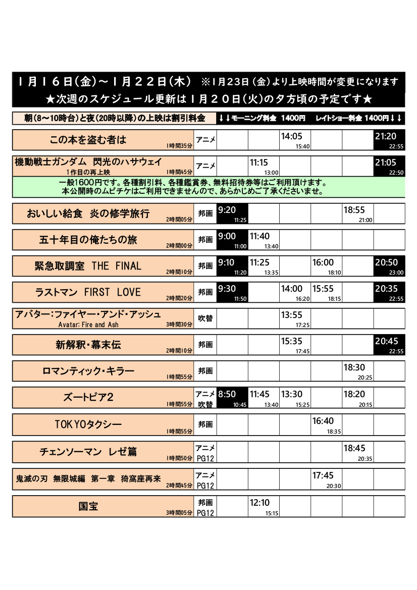 映画館シネマ太陽帯広 > 1/16(金)~1/22(木)の上映スケジュールはこちら
