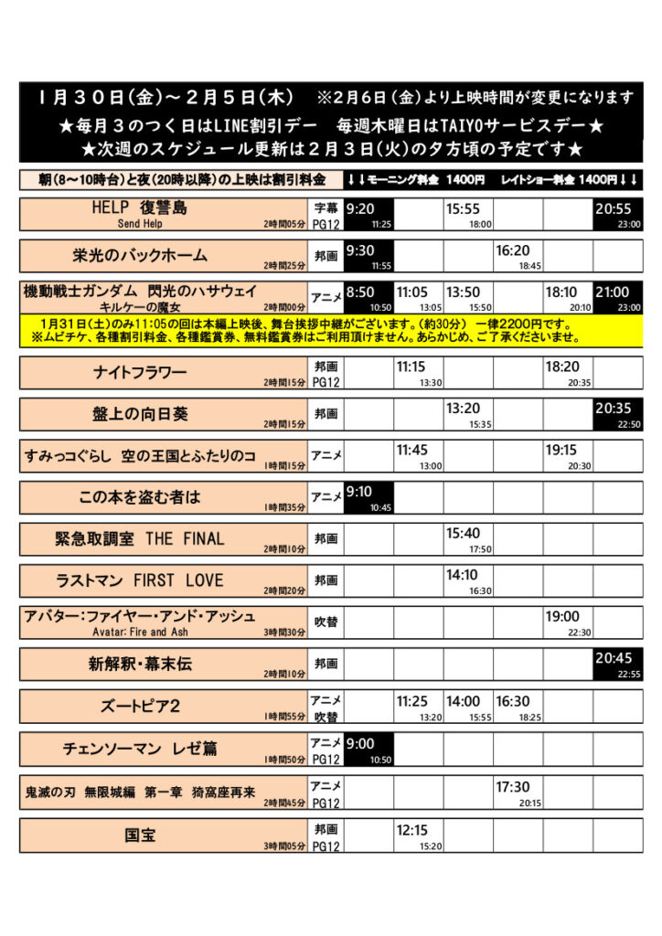 映画館シネマ太陽帯広 > 1/30(金)~2/5(木)の上映スケジュールはこちら(毎週火曜更新)