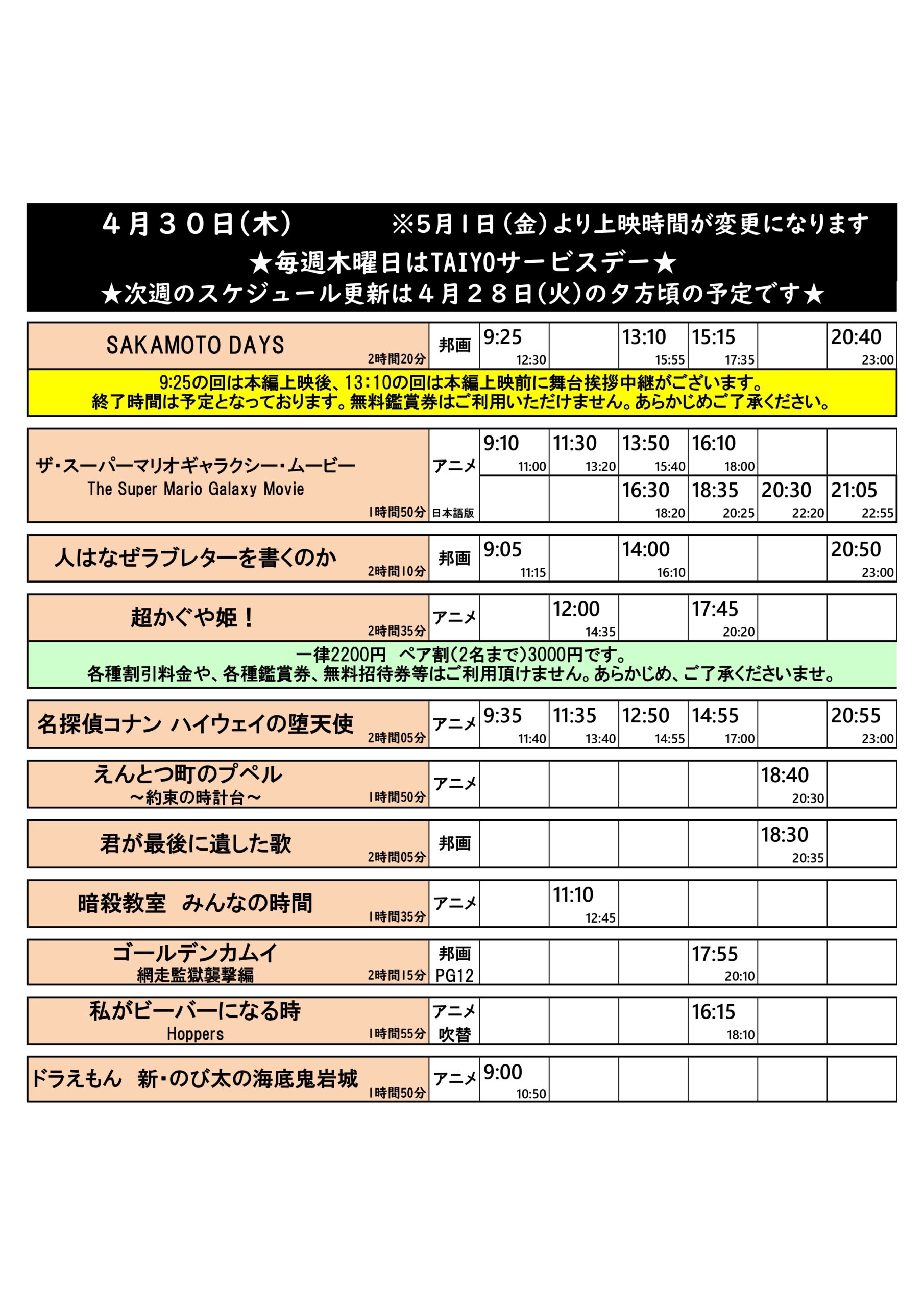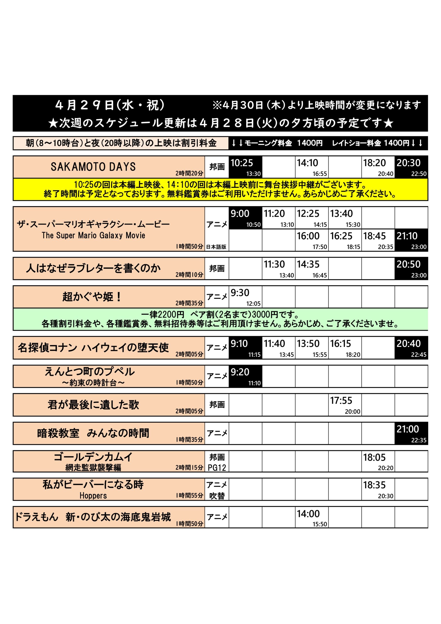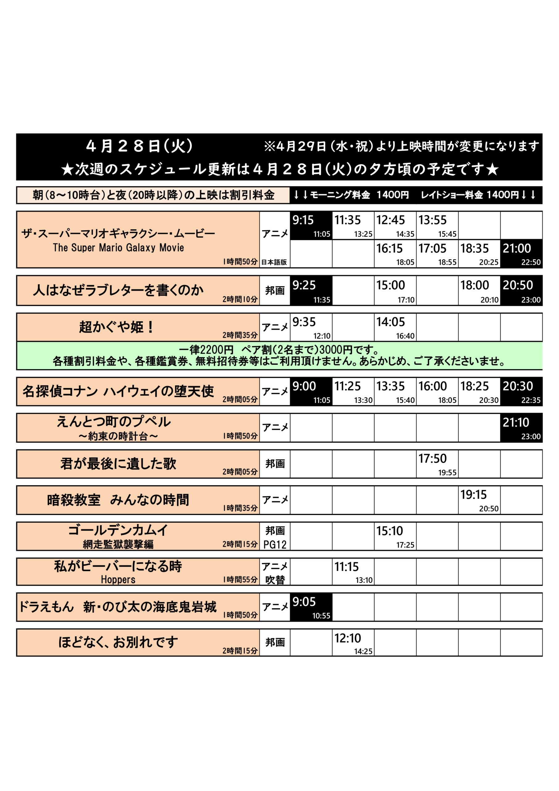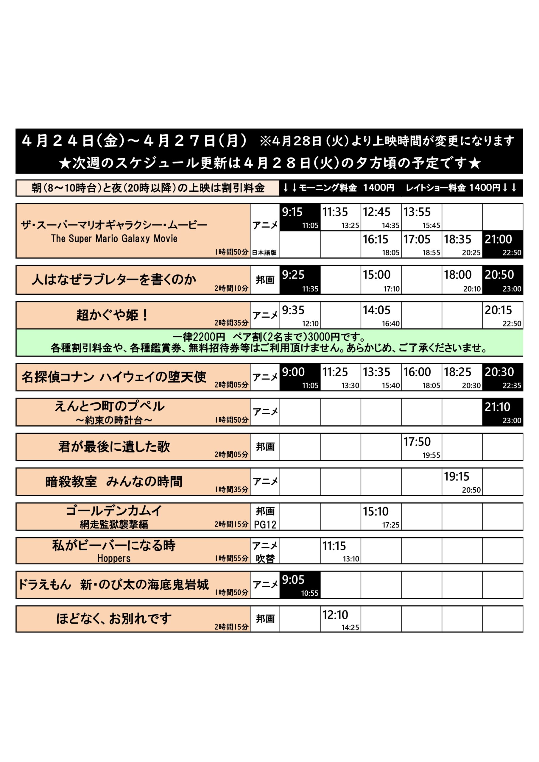 4/24(金)~4/30(木)の上映スケジュールはこちら※画像4枚あり(毎週火曜日更新)
